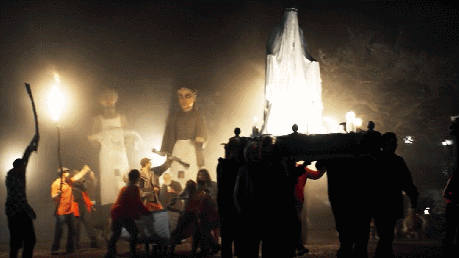 庆典上,人们围绕着恐怖的巨型人偶,欢呼雀跃。