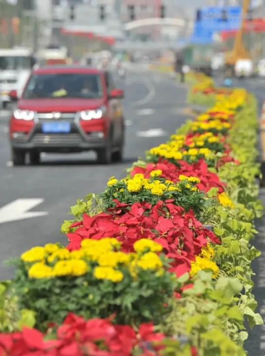 解放路配套绿化工程也是再现“锦绣太原城”的集中体现。以打造景观大道、浪漫大道为目标,建设者运用绿化美化彩化等形式,形成了绿不断线、处处有景的风景线。通过在道路两侧机动车、非机动车隔离带和街边游园栽树植绿,解放路全线绿化面积达到了10.3万平方米。其中,栽植乔木近5000株,新增游园绿地60处。国庆期间,府城段内长长的由一品红和金色菊花构成的路中花带,既起到了分隔道路的功能,又让来往的市民心旷神怡。