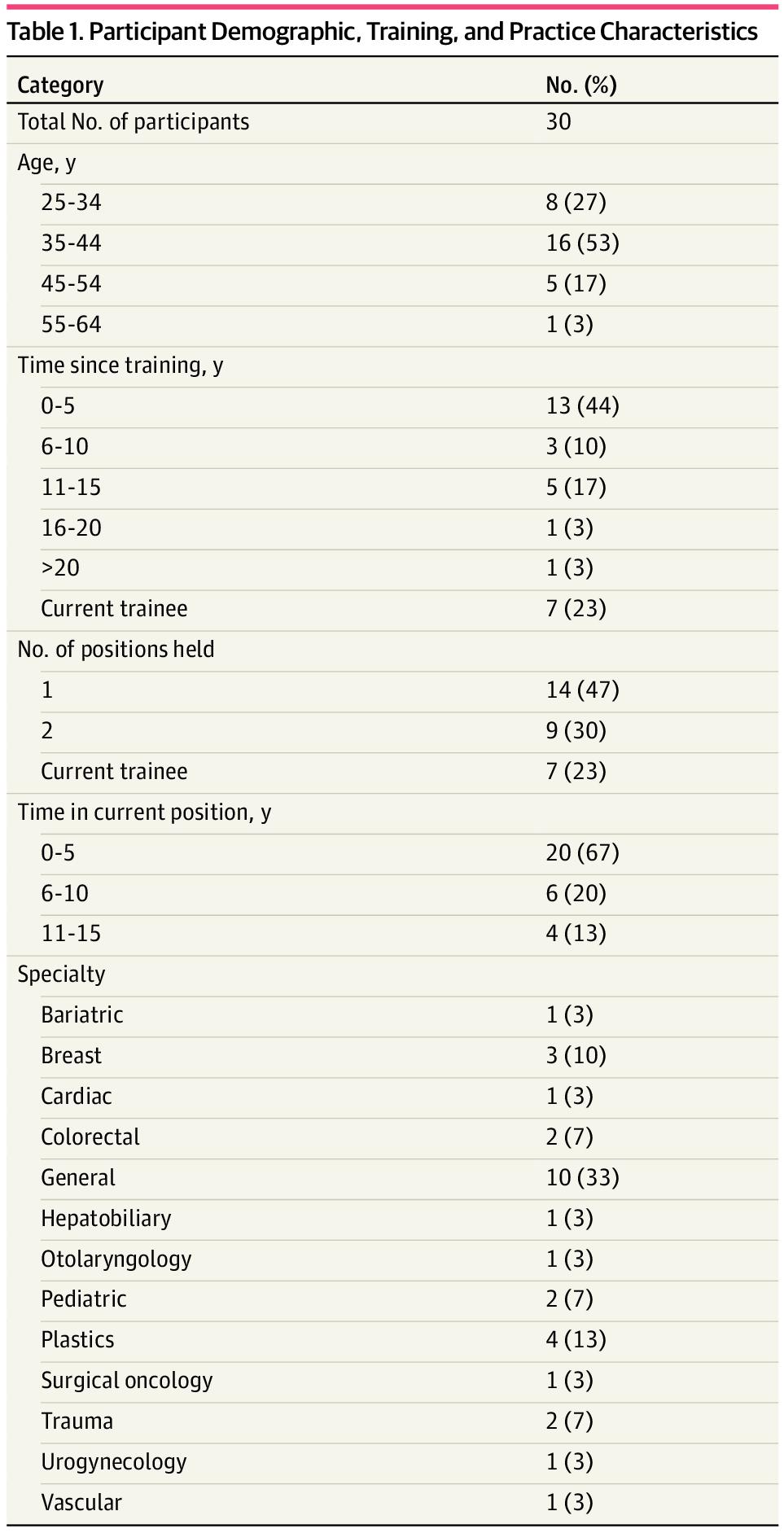 研究最后采访了来自美国不同外科专业的30名女外科医生(8名[27%]年龄25-34岁,16名[53%]年龄35-44岁,5名[17%]年龄45-54岁,1名[3%]年龄55-64岁。大多数参与者年龄在45岁以下,从业时间不到10年,这与美国女外科医生的年龄分布和经验水平一致。