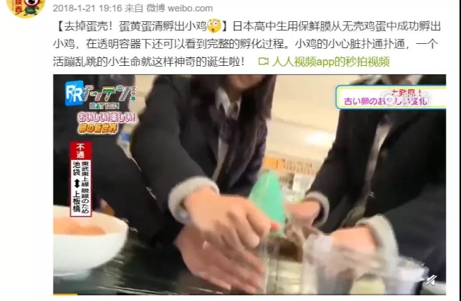 日本高中生的无壳鸡蛋孵化实验,图片来源微博