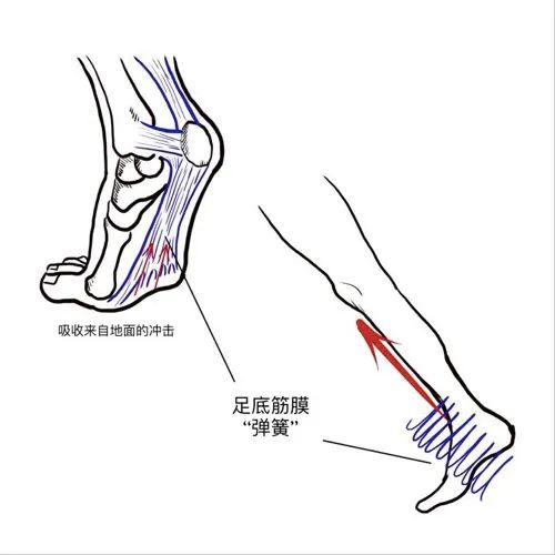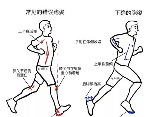 正常跑步时,身体稍稍前倾,每迈出一步,脚掌在身体重心正下方踩到地面,足底筋膜和足弓像弹簧一样把地面反冲力吸收掉,可以最大程度地减少其余部位的损伤。