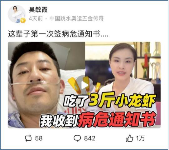 原因是她的老公张效诚吃了3斤小龙虾后,住了一周ICU。
