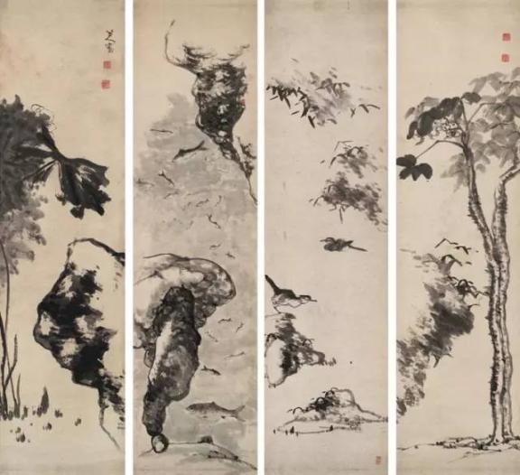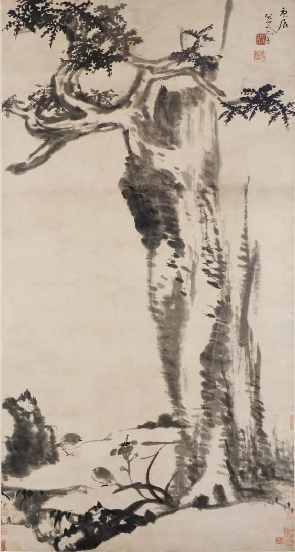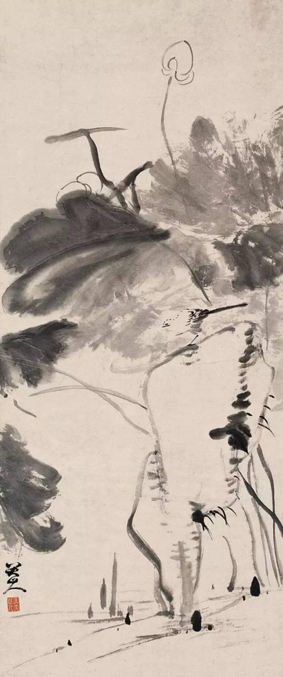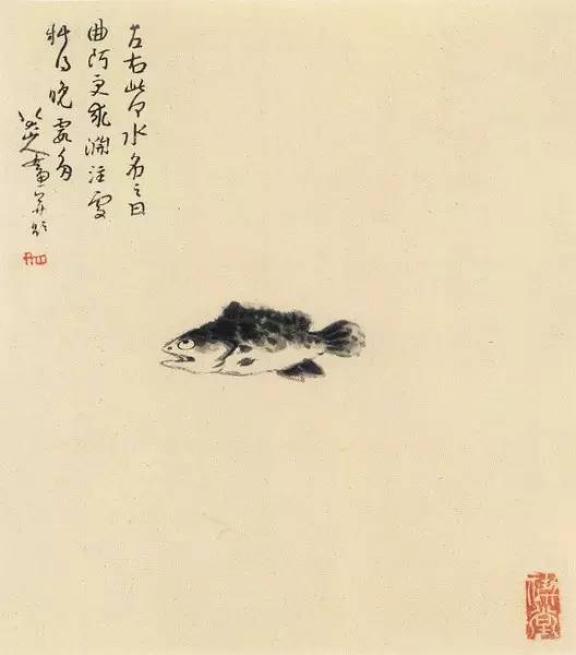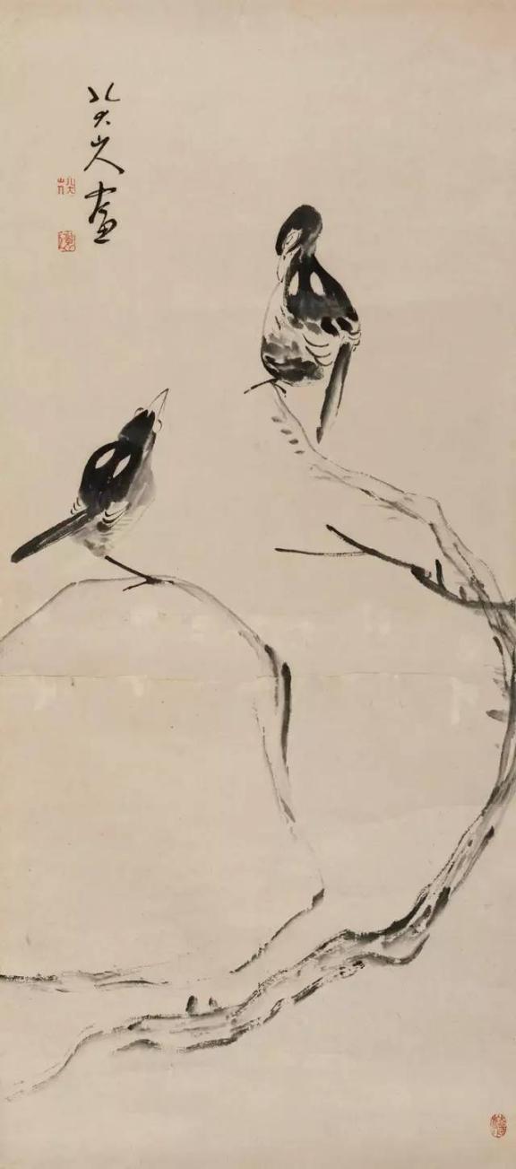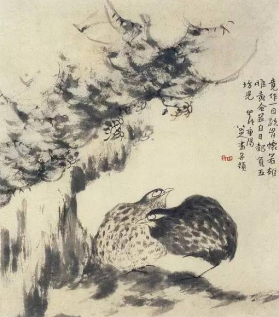 笔势变为朴茂雄伟,造型极为夸张,鱼、鸟之眼一圈一点,眼珠顶着眼圈,一幅“白眼向天”的神情。他画的鸟有些显得很倔强,即使落墨不多,却表现出鸟儿振羽,使人有不可一触,触之即飞的感觉。