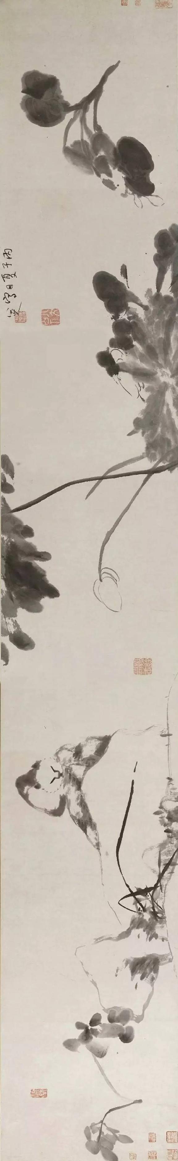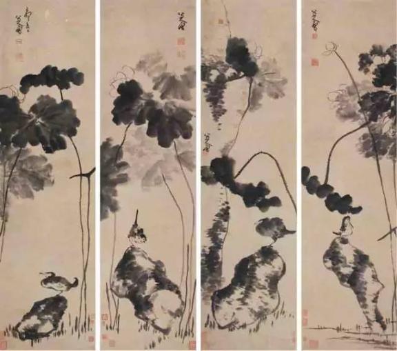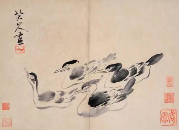 他的大写意,不同于徐渭,徐渭奔放而能放,八大山人严整而能放。清代中期的“扬州八怪”,晚期的“海派”以及现代的齐白石,张大千、潘天寿、李苦禅等巨匠,莫不受其熏陶。
