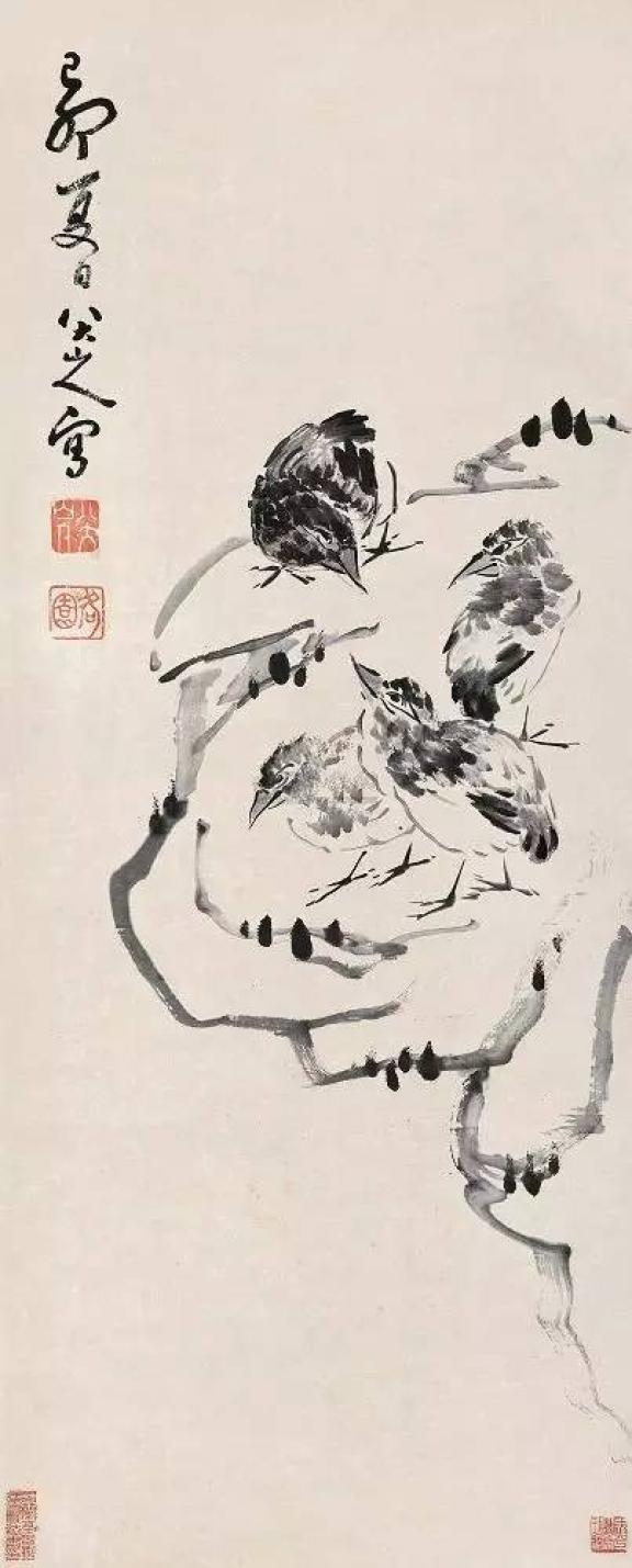 50岁至65岁为中期,画风逐渐变化,喜绘鱼、鸟、草虫、动物,形象有所夸张,用笔挺劲刻削,动物和鸟的嘴、眼多呈方形,面作卵形,上大下小,岌岌可危,禽鸟多栖一足,悬一足。