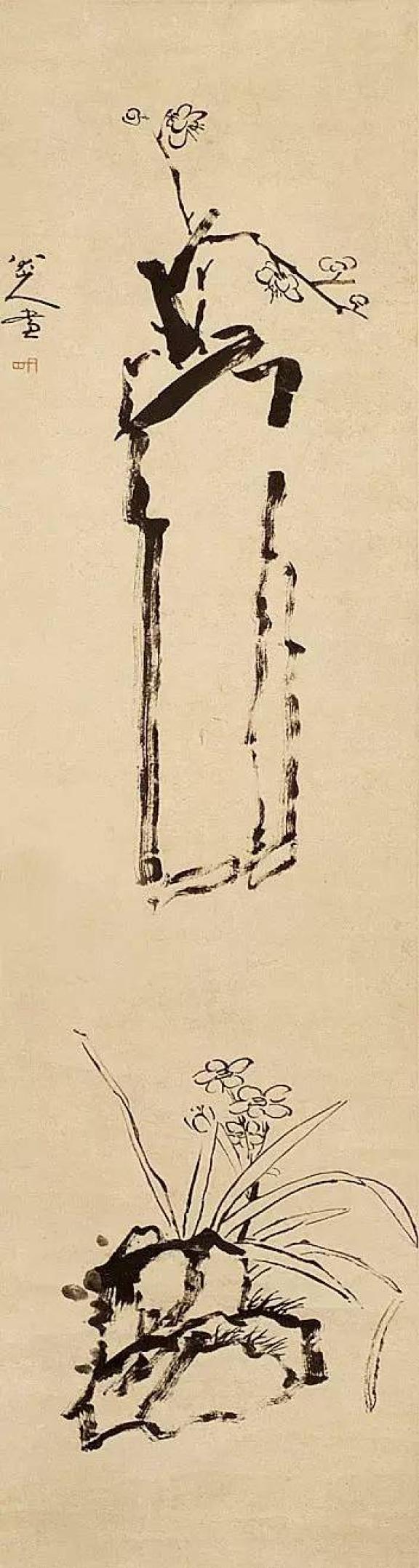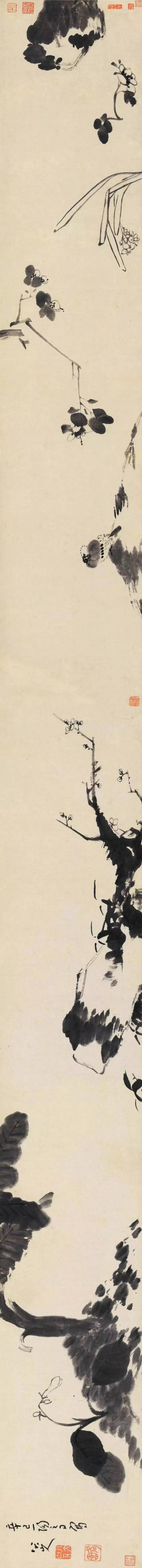 他的画,笔情恣纵,不构成法,苍劲圆秀,逸气横生,章法不求完整而得完整。他的一花一鸟不是盘算多少、大小,而是着眼于布置上的地位与气势。