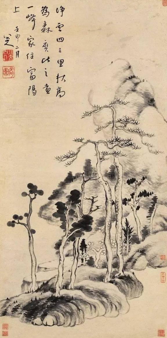 他在题黄公望山水诗中写道:“郭家皴法云头小,董老麻皮树上多。想见时人解图画,一峰还与宋山河。表现出他的民族意识。