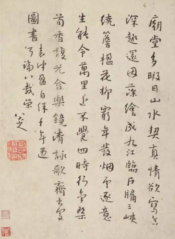 总的来说,八大山人57岁以前所有书画作品上的题画诗文,总体特征和倾向是借书画抒发自己的遗民思想、人品气节,往往将禅家遏语和历史典故杂糅在诗文之中,因而诗文隐晦曲涩。如《传綮写生册》中的《题画湖石》:击碎需弥腰,折却楞伽尾:浑无斧凿痕,不是惊鬼神。又如52岁作的《梅花图册》中的《题折枝梅》:三十年来处士家,酒旗风里一枝抖。断桥荒藓无人间,颜色于今似杏花。这首诗,几乎像作自似的描述了诗人的人品和气节。