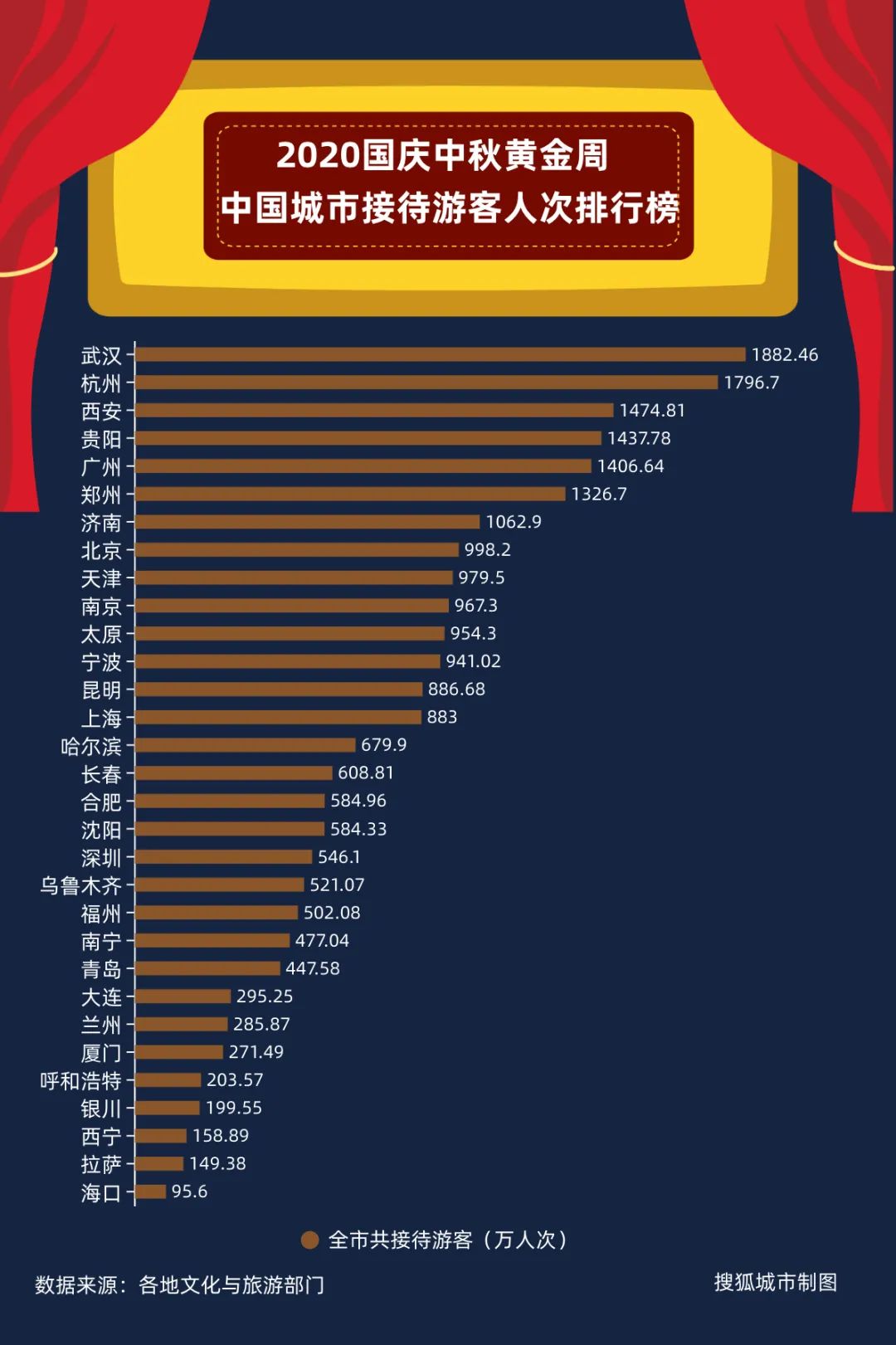 2020国庆中秋黄金周,中国城市接待游客数量榜/搜狐城市制图从疫情期间的暴风眼,到国庆中秋黄金周游客接待量排名榜首,武汉旅游业缘何能够如此快速地复苏?