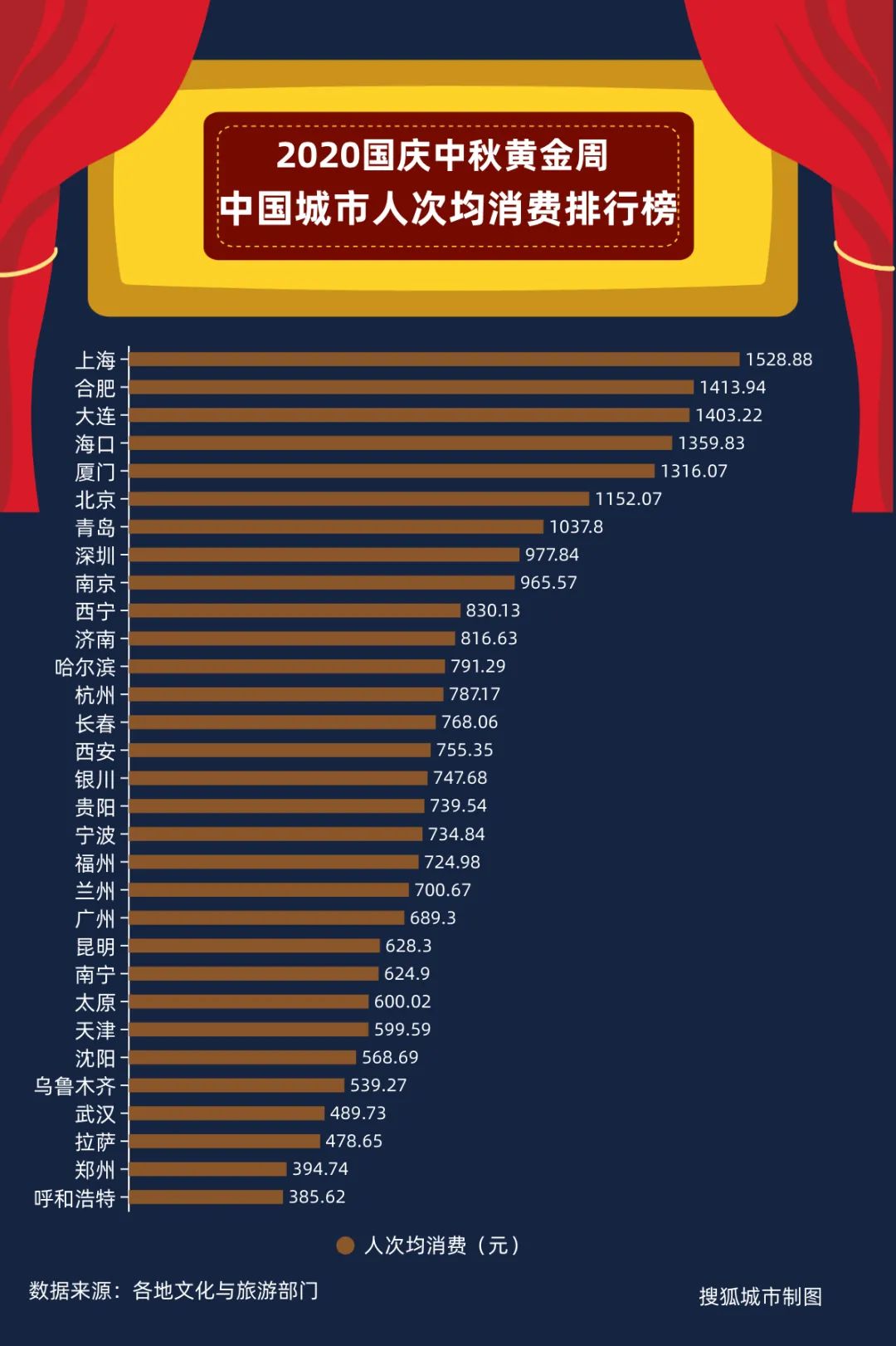 2020国庆中秋黄金周,中国城市游客人次均消费榜/搜狐城市制图从游客人次均消费来看,上海、合肥、大连、海口、厦门、北京、青岛七市,黄金周期间游客人次均消费突破千元。