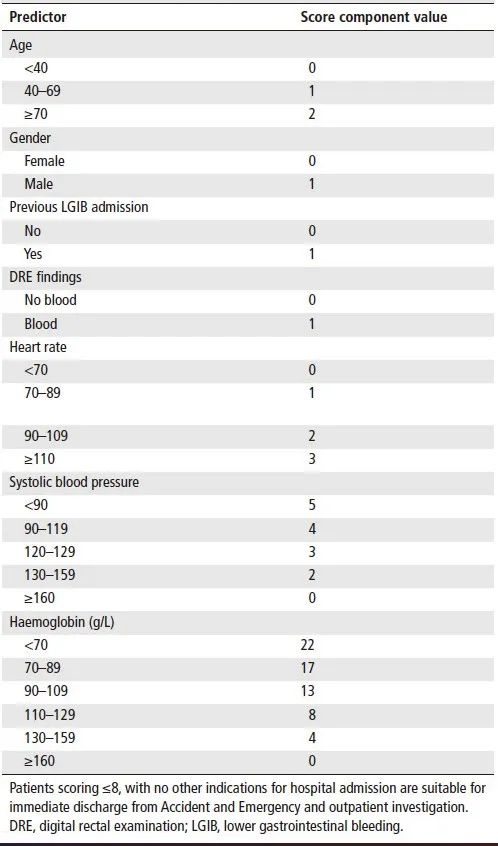 稳定性出血患者(SI≤1)通过奥克兰评分(Oakland score)分为轻微出血和严重出血。建议轻微出血(奥克兰评分≤8分)、不存在其他住院指征的患者出院接受门诊治疗;严重出血患者应该住院进行结肠镜检查。但不同于ACG指南的是,BSG认为目前的证据尚不支持肠镜检查必须在24小时内完成。