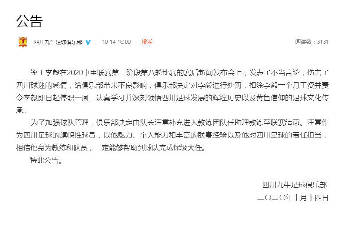 @四川九牛足球俱乐部 10月14日发布公告:鉴于李毅在2020中甲联赛第一阶段第九轮比赛的赛后新闻发布会上,发表了不当言论,伤害了四川球迷的感情,给俱乐部带来不良影响,俱乐部决定对李毅进行处罚,扣除李毅一个月工资并责令李毅即日起停职一周,认真学习并深刻领悟四川足球发展的辉煌历史以及黄色信仰的足球文化传承。