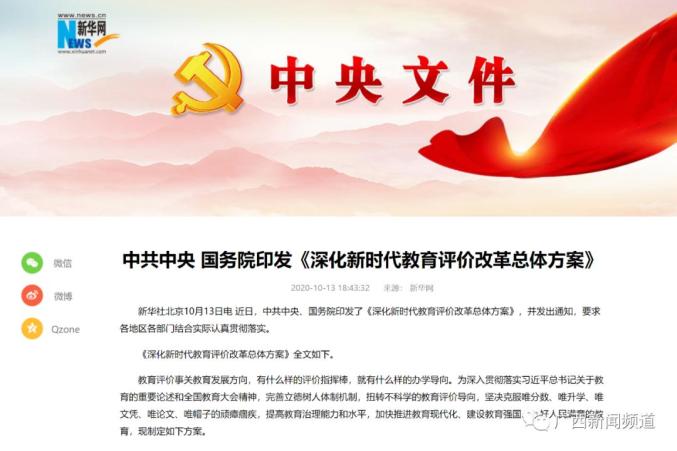 10月13日, 新华网发布了中共中央 国务院印发的《深化新时代教育评价改革总体方案》。