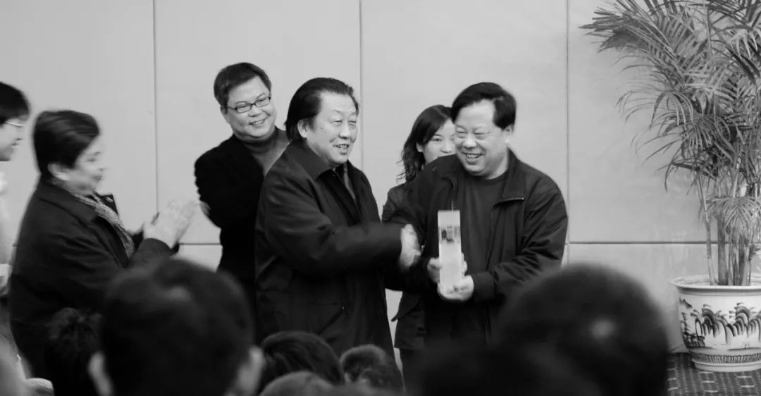 2005年,张文成董事长(右一)向朱守训颁发“杰出贡献奖”。“文化经营”是华森的经营战略之一。华森定位为学术科研型企业,不是做普通设计,而是追求设计精品;不是单纯完成设计生产任务,而是追求学术与生产并重。