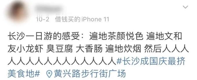 而在社交平台上,“打开微信,一整个朋友圈仿佛都在长沙”。微博上,“国庆节全国人民都想来长沙”“长沙成国庆最挤美食地”……在喜提多个热门话题后,长沙俨然成为网红城市“代名词”。