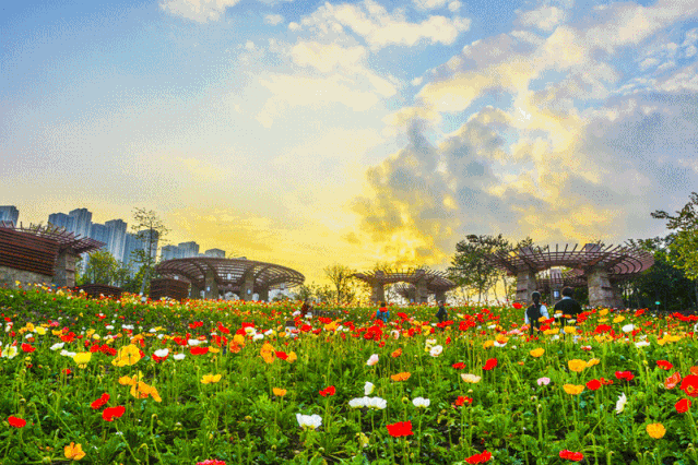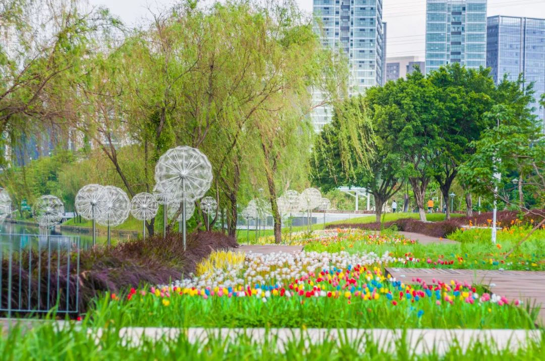 花海建设是公园一大亮点。踏入公园,五彩缤纷的花朵竞相开放,从蜿蜒展开的空中观景廊道一路走过,能见满目绿意。