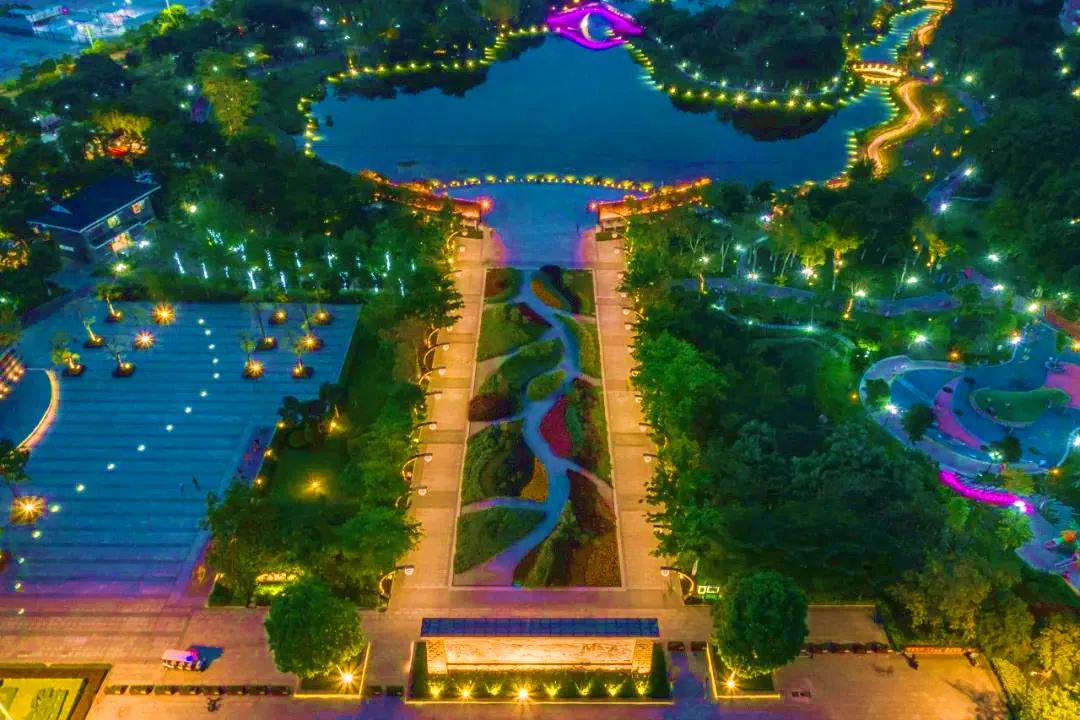 入夜后,映月湖公园被灯光照亮,放眼望去,满目流光溢彩,灯水相映,显现出城市的烟火暖意。