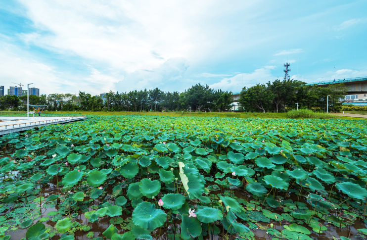 进入公园,清澈的湖水与一排排树木让人尽享清新空气。水面上,一片片荷叶绵延而生,为湖水覆盖上一层赏心悦目的绿意。