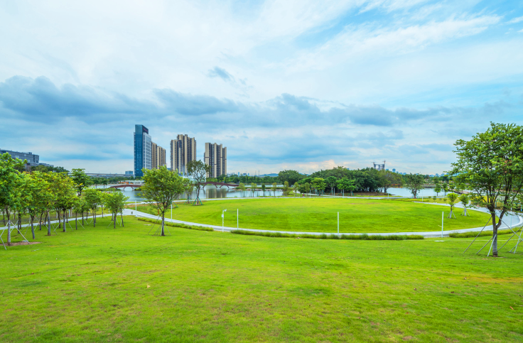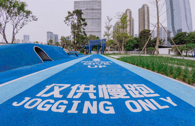 大片阳光草坪增加城市绿肺,在其中漫步,可享受自然乐趣。环绕草坪的是蓝色慢跑径,市民可在此慢跑健身,累了还可在草坪上休息娱乐。
