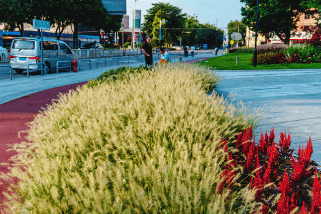 “狼尾草”等网红草被引入栽种在公园每个角落,鲜花绽开在草木中,大片天鹅绒草地十分显眼,缤纷美景带来自然生机。