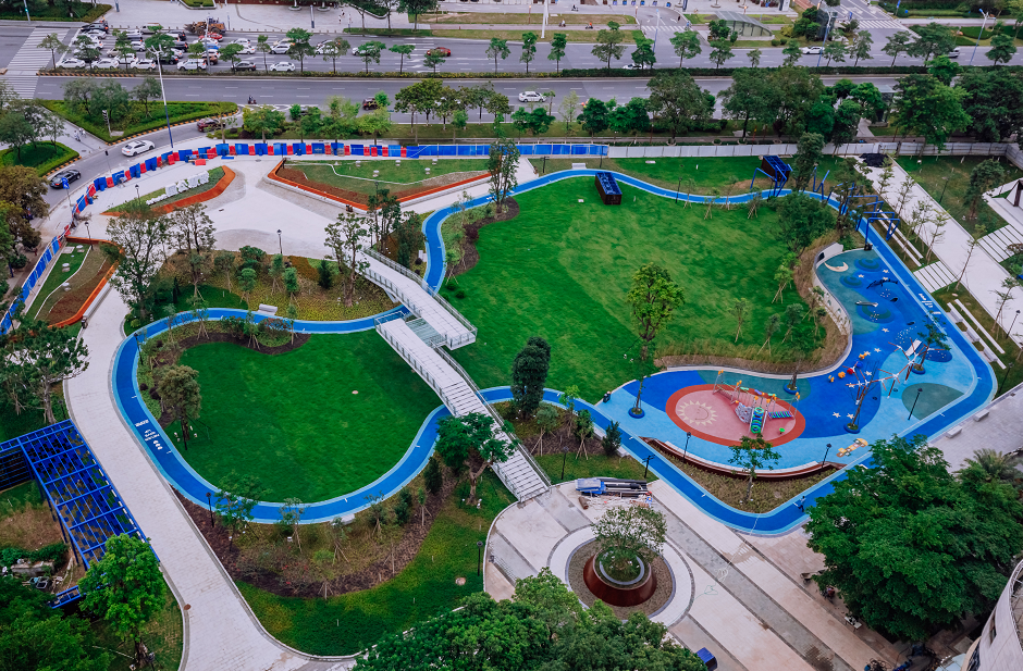 它占地面积约520平方米,共有四个运动游乐区域,旨在为3-12岁儿童定制打造体适能亲子互动小游园,构建社区亲子游乐圈。