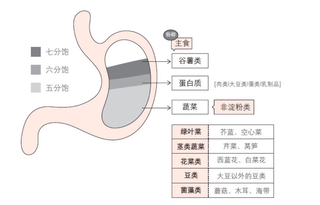所以,食量大的人要达到 7 分饱自然会吃下更多的各类食物,从而符合他们的身体需求;而胃口小的人则可以吃更加合理的分量,而不会出现“刚吃下膳食指南规定的蔬菜和谷物量后,突然发现根本吃不下任何肉”的情况,后面这个问题在很多运动较少的娇小女性中非常常见。因此调整顺序和衡量的方法其实尊重了每个人的具体情况,同时也呼应了膳食指南的推荐。