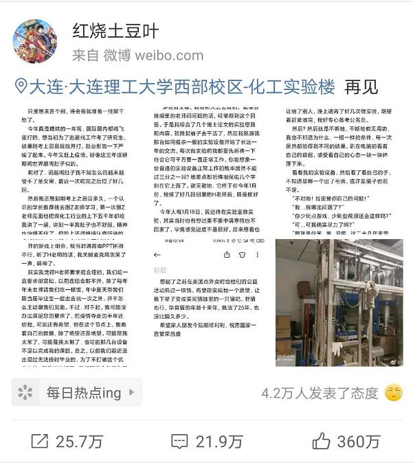 10月13日凌晨2点,网友“红烧土豆叶”在微博发布一篇约两千字的遗书,称自己为大连理工大学化学工程研三学生,在表达自己因课题实验长期受挫可能面临延毕后,准备结束自己的生命,并配图疑似在实验室自缢。