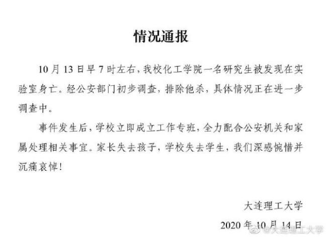 大连理工大学官方微博对此情况通报称,在10月13日早7时左右,该校化工学院一名研究生被发现在实验室身亡。经公安部门初步调查,排除他杀,具体情况正在进一步调查中。事件发生后,学校立即成立工作专班,全力配合公安机关和家属处理相关事宜,学校对此深感惋惜并沉痛哀悼。
