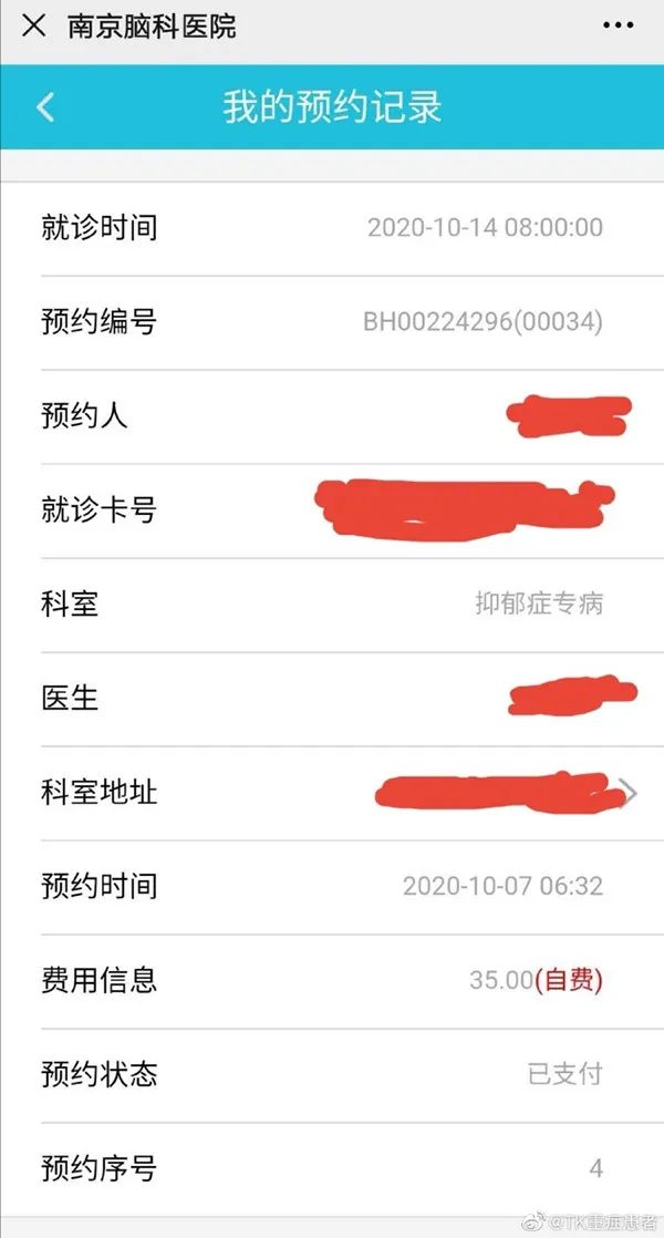 于先生公布的一张截图显示,其女友预约了南京脑科医院抑郁症专病科室,预约时间是2020年10月14日8点。