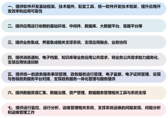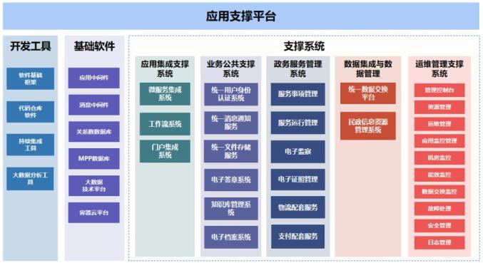 主要提供开发工具支撑、基础软件支撑、应用融合支撑、业务公共能力支撑、政务服务支撑、数据治理支撑、应用运维管理等工具支撑。