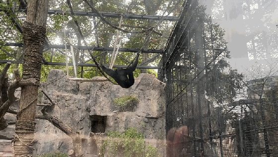 它们时而摆荡于藤蔓栖架之间、时而在假山上或者吊床里休息、时而腾空飞跃、时而见它们摘一片新鲜的芭蕉叶咀嚼、时而见它们引吭高歌、时而见它们互相观察、时而飘来一股沁人心脾的桂花香…同时满足了动物的视觉、嗅觉、味觉、听觉和感觉的五重体验,福利水平大幅度提升。