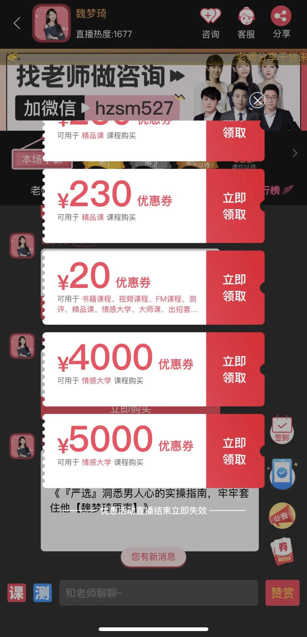 〓 来源 / 花镇APP不止一位购买花镇APP服务的用户向深燃表示,他们大多先在导师的直播间听免费的前期课,直播间内时不时会发放20元到5000元不等的优惠券,最初报名了训练营的大班课,在群里咨询得不到解答或被告知“要学习的内容非常多”后,报名了一对一的私教课。