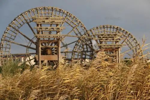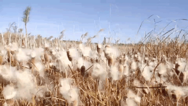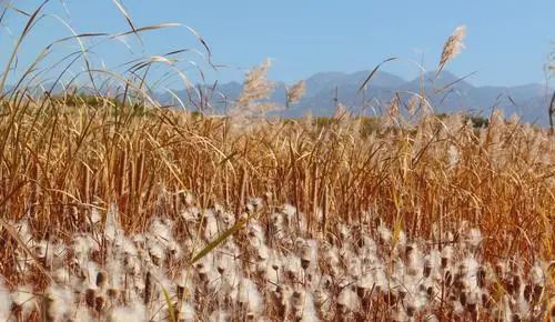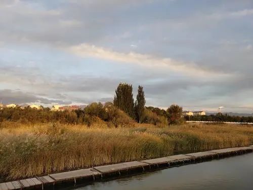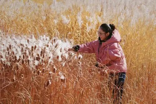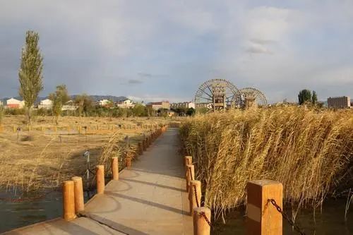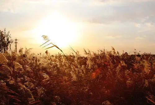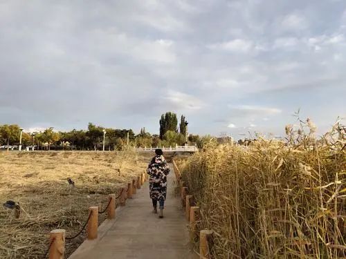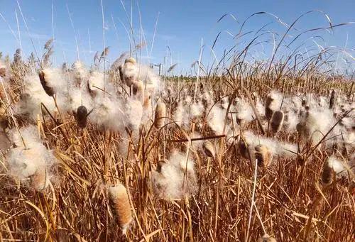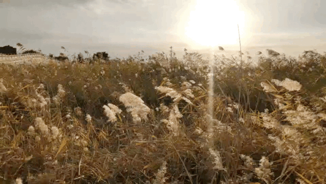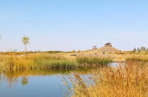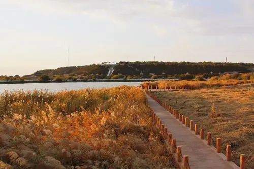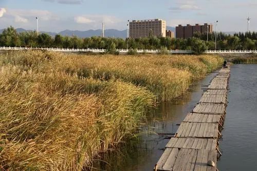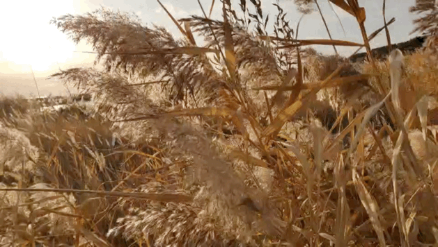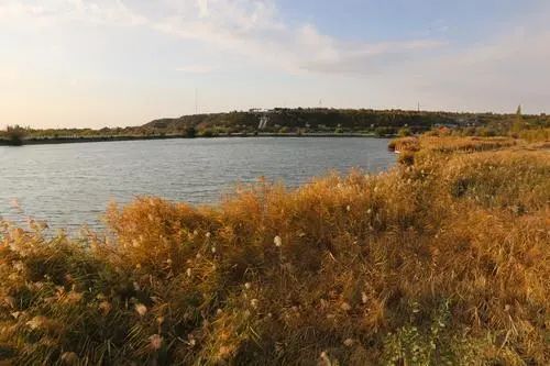 在敖包生态公园的人工湖畔泛黄的芦苇随风摇曳