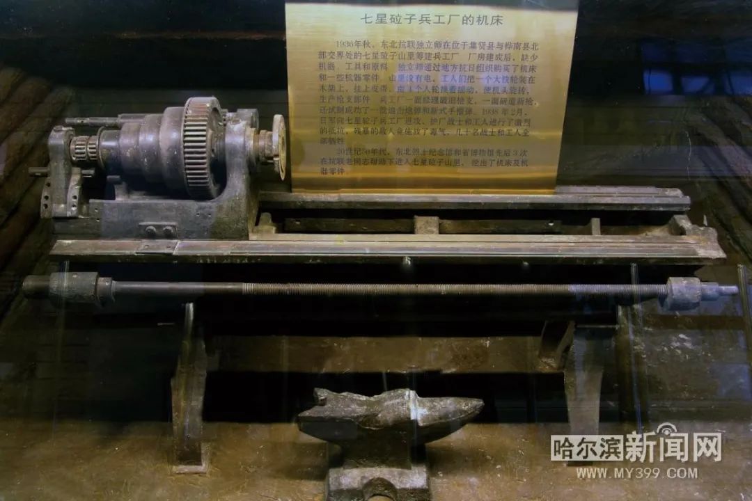 1936年夏,东北抗联独立师在位于桦川县东南的七星砬子群山里建立一座秘密的兵工厂。兵工厂的筹建和生产困难重重。这台机床的运转需要电来做动力,山里没有电,工人们就把缴获的汽车发动机安装起来,烧油发电。断油时,工人们就在山沟里筑水坝,用水轮带动发电机发电。最困难的时候工人们把大铁轮安装在木架上,挂上皮带,几个人轮换着用人力摇动,使机头旋转,生产枪支部件。就是在这样简陋的条件下,兵工厂竟然在一个月的时间里生产了100支名叫“匣橹子”的手枪以及后来能打三八子弹的直把轻机枪。