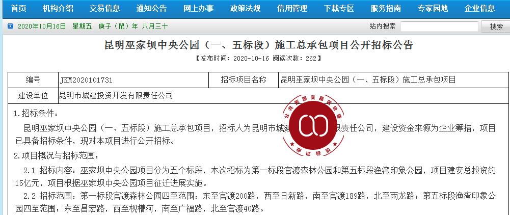 时隔一年,昆明巫家坝中央公园(一、五标段)施工总承包项目再次公开招标。