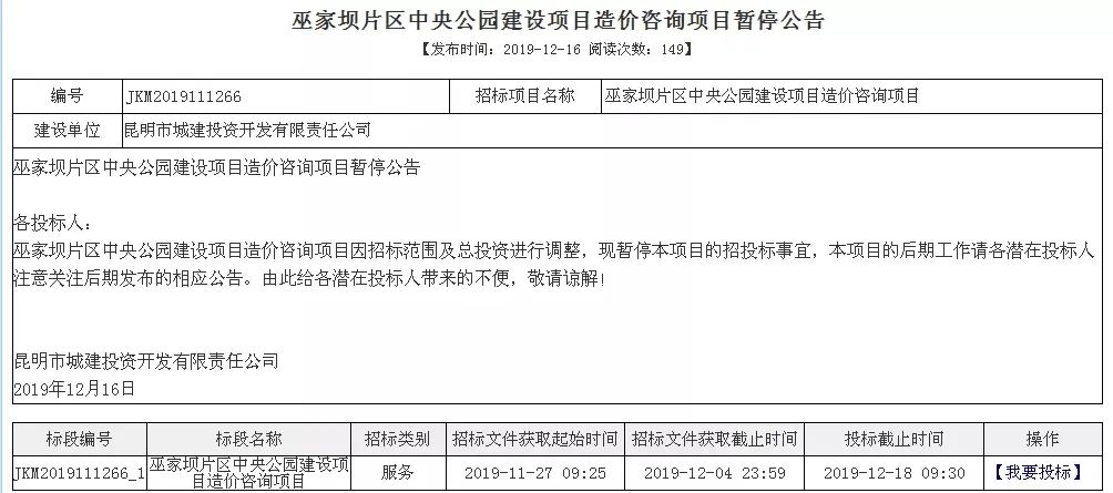 到12月16日,昆明市城建投资开发有限责任公司发布《巫家坝片区中央公园建设项目造价咨询项目暂停公告 》,原因为项目招标范围及总投资有调整。