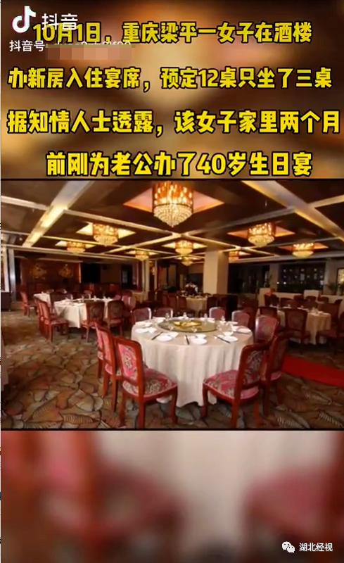 近日,短视频平台上一条视频引热议。视频里称,10月1日,重庆梁平一女子在酒楼办新房入住酒席,预定12桌只坐了3桌。原因是,该女子家里两个月前刚为老公办了40岁生日宴。