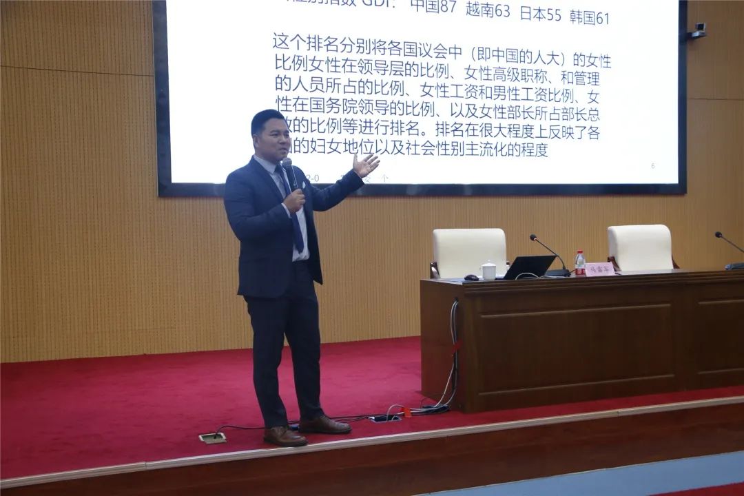 马雷军讲师以《社会性别平等的国际标准以及其在中国的实践与挑战》为题,从习近平总书记在中国政府和联合国妇女署在举办全球妇女峰会的主题发言出发,讲解了性别平等的国际标准,分别从中国妇女的地位、男性战略VS女性细致、性别平等和男性的关系、什么是性别歧视和工作中如何落实性别平等六个方面阐述了性别平等在中国的实践与挑战。