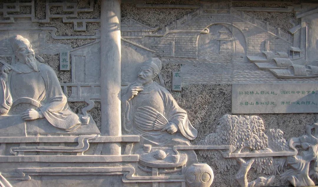 陆羽(左)与皎然(右)祭岳渎使卢幼平是前湖州刺史,由越返京,途径湖州。这是颜真卿抵湖后,有据可查的第一次重要政务活动,也是第一次较大规模的雅聚。皎然有《同诸公奉侍祭岳渎使大理卢幼平自会稽回经平望》诗记其事,诸公的首领应该就是颜真卿了。皎然还有一篇散文《兰亭古石桥柱赞》记载此事: