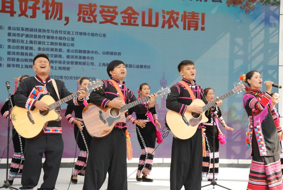10月18日上午,2020年云南普洱特色商品上海金山展销会在百联金山购物中心中庭广场举行。开幕式活动中,来自普洱市宁洱、墨江、景东、镇沅对口四县的挂职干部为“第二故乡”特色商品代言。