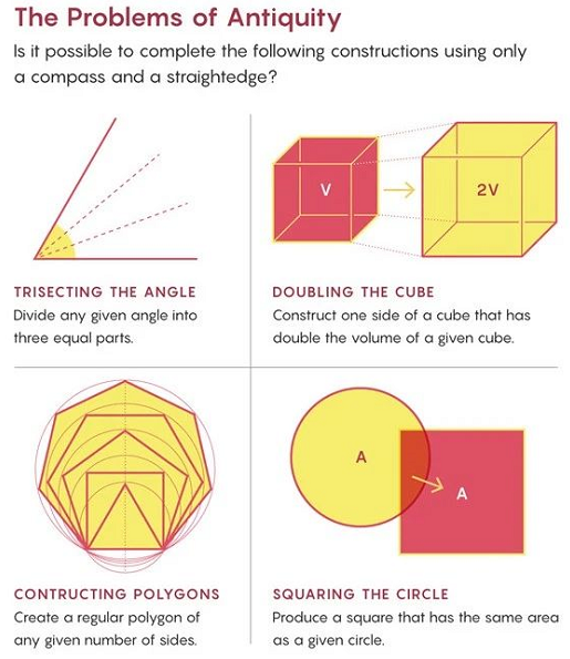 一个多世纪后,欧几里得赋予了直线和圆“几何学基本曲线”的地位。于是,一代又一代的几何学家在解决诸如平分角、画垂直平分线等等问题时,开始只使用圆规和直尺。某些看似简单的问题,令希腊几何学家一筹莫展,诸如将任意角三等分、将正方体体积变为原来的两倍、构造任意正多边形、构造一个与圆相同面积的正方形。这些问题最终到达了神话般的高度,困扰了数学家两千多年。