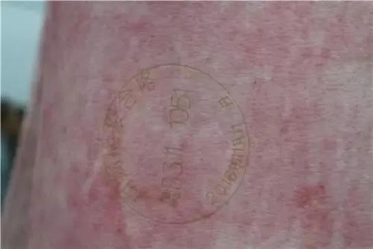 “这是猪肉检疫合格章,所使用的是食品色素制成的颜料,就像平时我们吃的蛋糕都会有这种色素,对人体是无害的。”