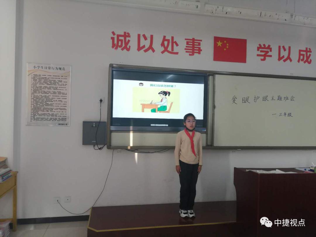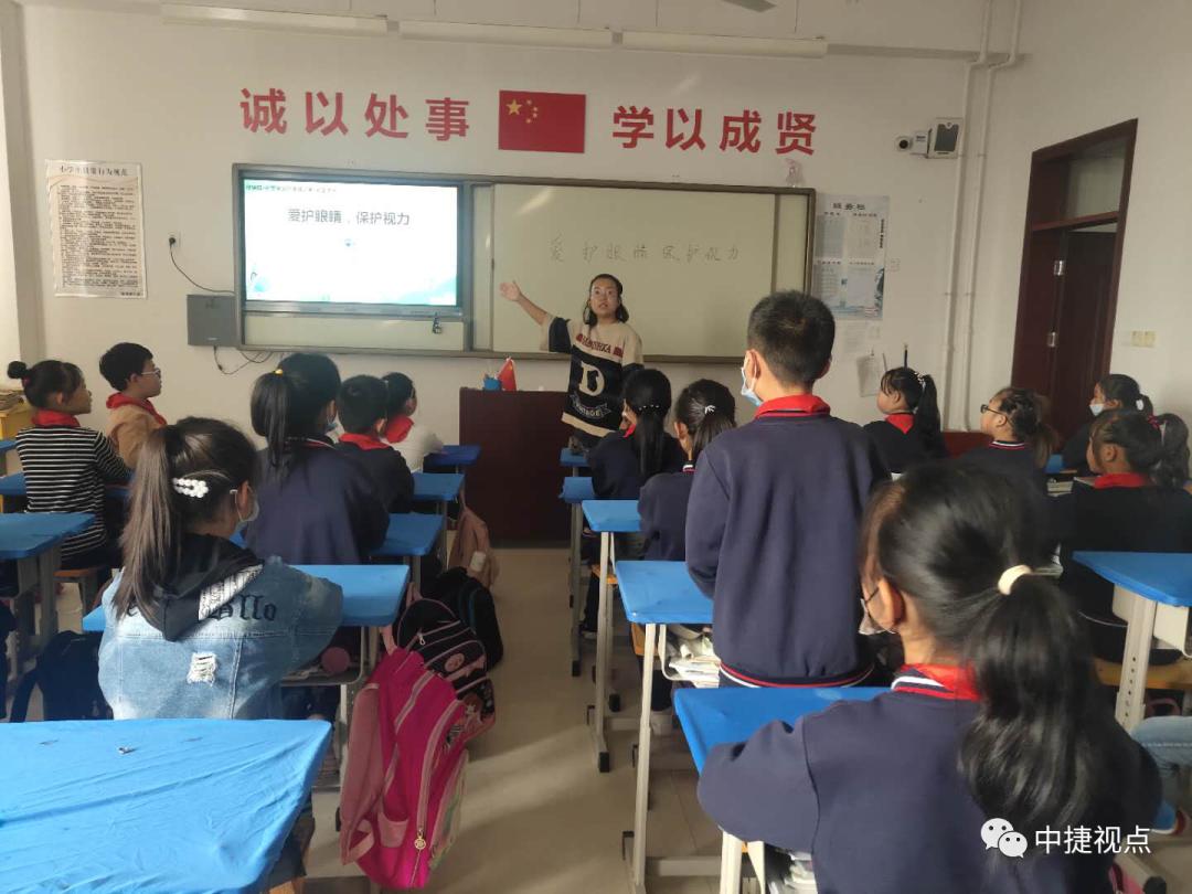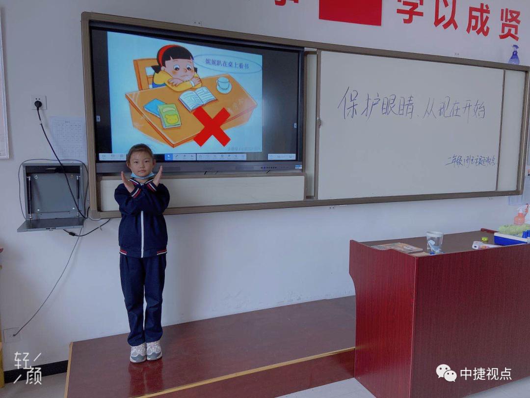 为进一步加强青少年爱眼护眼近视综合防治,培养学生从小养成爱眼护眼好习惯,普及科学用眼科学养眼知识,提高眼健康整体水平,2020年10月12日至10月16日,中捷产业园区集贤路小学开展第二届“保护心灵之窗”系列活动。爱护眼睛,拒绝近视!国旗下,学生代表向全体同学发出倡议:保护心灵之窗,从我做起!
