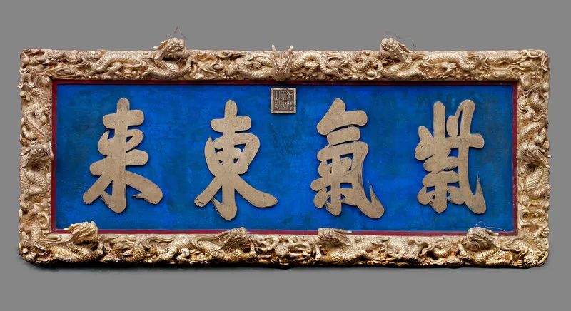 匾额为木雕髹漆、镶铜字制成,匾外框浮雕云龙图案,九龙之首采用圆雕工艺,生动灵活;匾面刷洋蓝,其上镶铜板制成的大字:“紫气东来”,文字中央上部镶朱文篆书“乾隆御笔之宝”印玺。