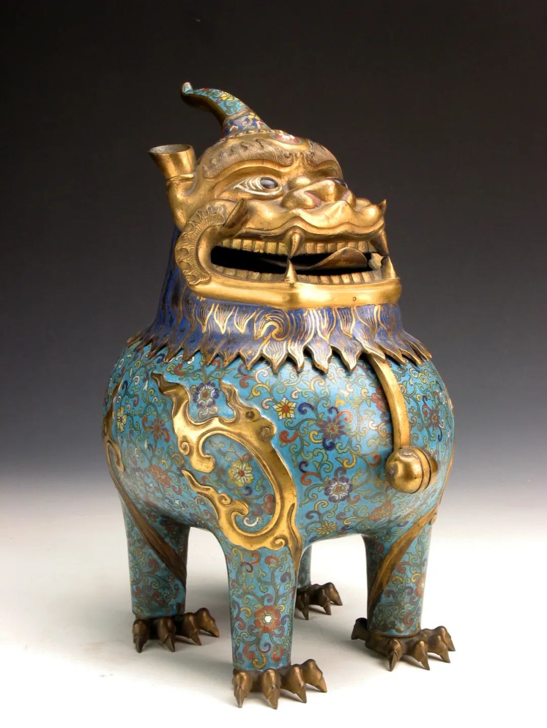 清乾隆朝宫殿陈设品、实用器,通常放置于大殿内两侧堂陛之上,用以焚香和威慑殿堂,为成对使用,甪端头部稍微向上仰起,两排整齐的牙齿中间调皮地伸着舌头,短颈周围是披肩般整齐的蓝色描金头鬣,颈部、颌颈之纽、绕身火焰、足爪均为鎏金;独角和身体为豆绿色珐琅釉地,掐丝嵌以缠枝花卉纹。04