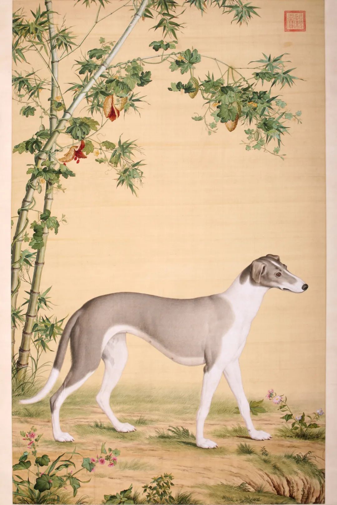 设色绢本。画面设色翠竹三株,与竹同生有苦瓜。瓜藤与竹枝相互缠绕低垂成荫,同时有熟透的苦瓜结出鲜红的果实,挂于竹间藤蔓上。一只西狑站立于芳草地上,地面有多种奇花异草,其目视前方,神态宁静怡然。右下自题:臣郎士宁恭绘。右上角钤:“怡亲王宝”朱文方印。作者用中西结合的绘画方式,使中国宫廷绘画带有前所未有的新的时代特征,即中西合璧的画风。05