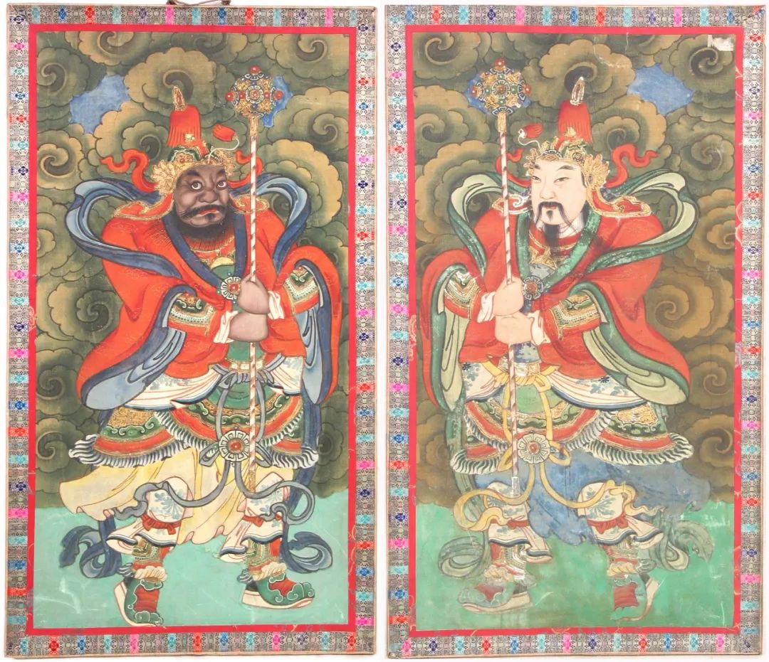 为清代宫廷原装原裱,保留了深厚的历史气息和文化特征,在国内博物馆中独一无二。它的装饰布置不是像民间那样贴在门板上,而是先装饰在安有铜饰件的框子上,届时在各宫院殿堂门上悬挂。宫廷门神画用料比较讲究,除在纸上木板印刷加以彩绘外,更多是画在粗绢或布上的,在绘制上则“细粉彩画沥粉贴金描金泥金”,是否运用沥粉贴金、描画泥金这道工序则是判断宫廷年画与民间年画区别的重要依据之一。06