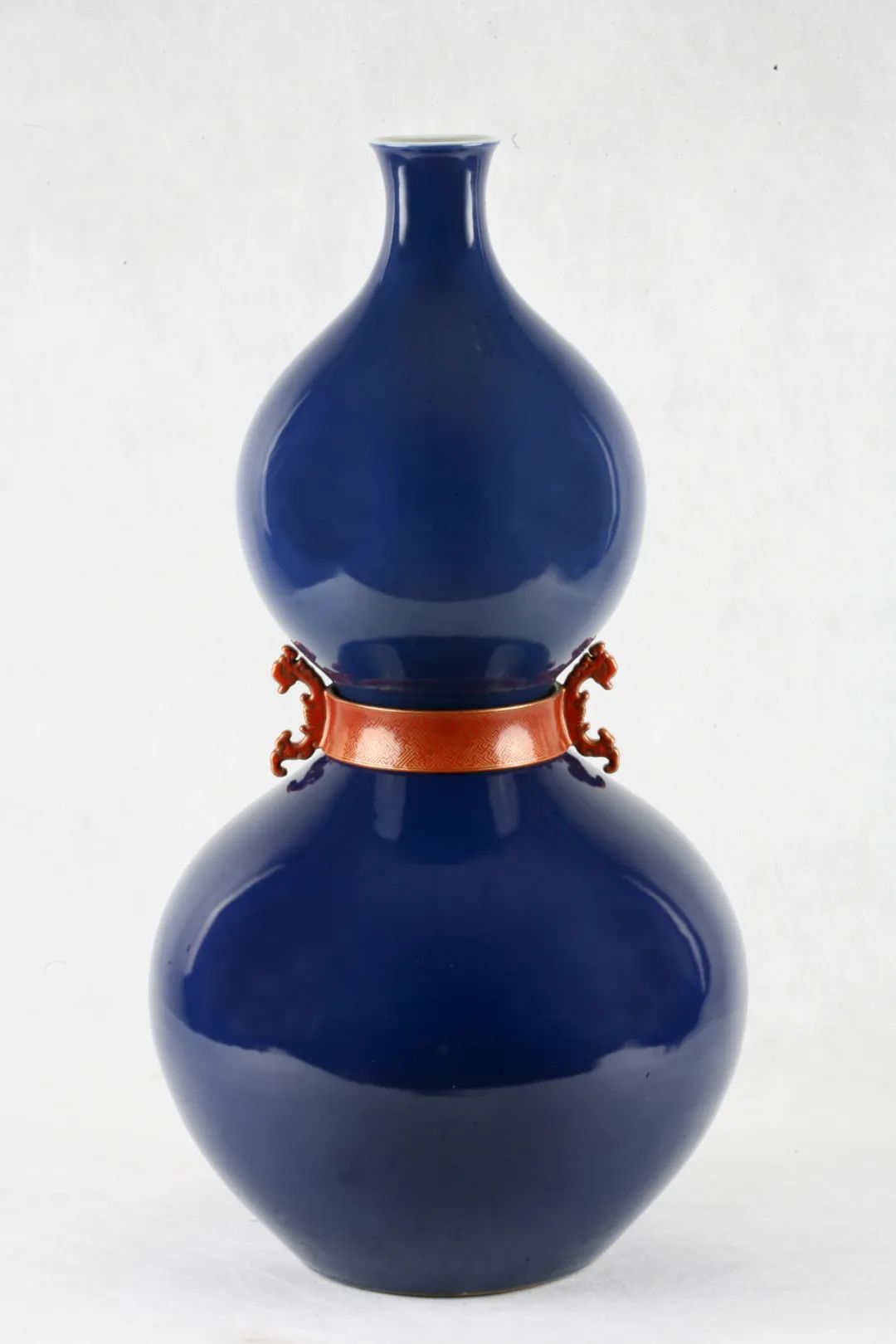 清宫陈设瓷,瓶为撇口,短细颈,总体如上小下大的束腰葫芦形;颈肩、腰部线条流畅,口内为白釉地,葫芦表面为霁蓝釉,深邃沉静,端庄精致;束腰间为一圈扁状活环,环两侧为螭龙耳,全环施红珊瑚釉,釉上绘“万字不到头”描金纹;瓶底为白釉地,中间有青花篆书“大清乾隆年制”6字3行方款,款识工整。07