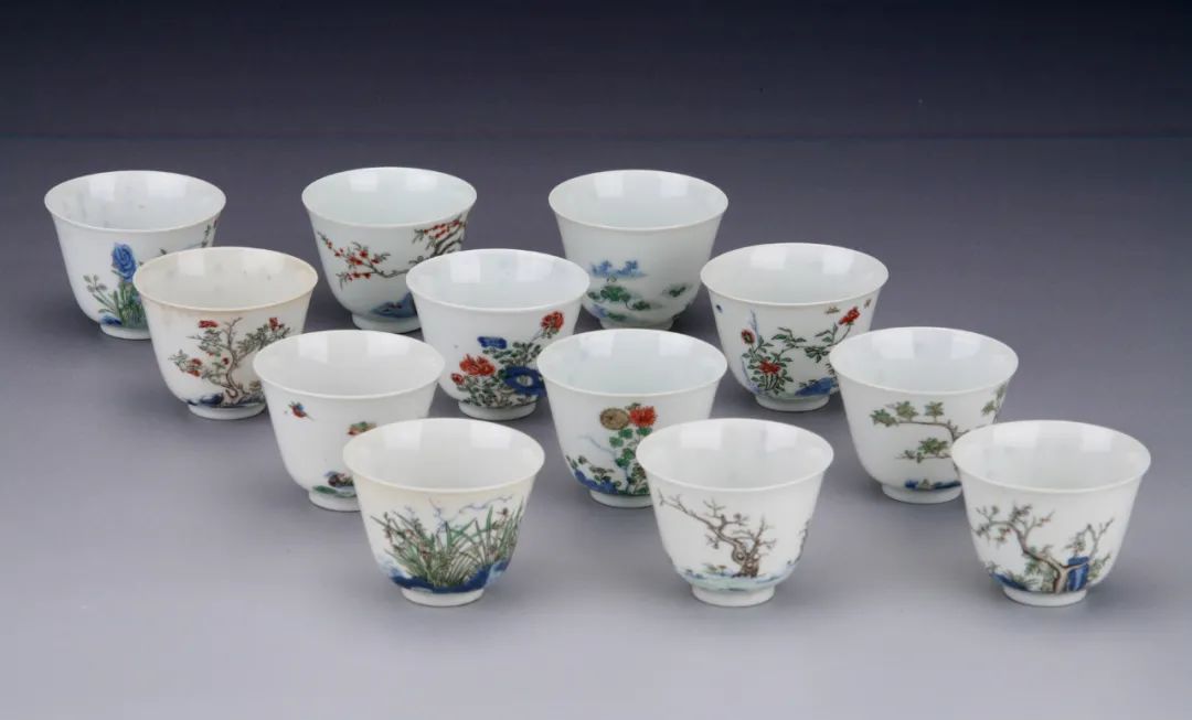 清宫生活用瓷、饮具,共12件。十二月花卉盅为康熙瓷器中的名贵品种,其12盅上所绘花卉,以某月一种花为象征,以12种花代表全年12个月,即水仙、玉兰、桃花、牡丹、石榴、荷花、兰花、桂花、菊花、芙蓉、月季、梅花。这套12月花卉盅为五彩烧制,形如仰钟,胎体玲珑薄巧,似乎脱胎,在素白地上绘以精彩的花卉,笔法细腻,生机盎然;每个酒盅外壁在花卉另一侧面,另缀以青花楷书五言诗句各两句,诗后有篆书“赏”字方章;盅底有青花双圈,内为楷书“大清康熙年制”6字两行款。09