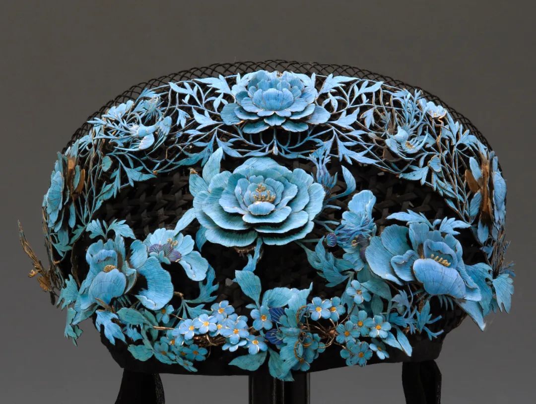 清宫后妃所戴点翠女帽,在清代被称为钿子。总体形状类于平顶帽,戴时顶部向后倾斜,上穹下广,顶如覆箕;整个帽子框架由竹藤编制而成,再用黑绸网格罩在帽架之外,前后部饰点翠装饰,前面为朵朵盛开的花瓣,帽顶覆双凤环绕牡丹,帽两侧垂有黑纱。点翠钿子以银质为胎,表面用蓝色翠鸟羽毛镶饰其上,色泽娇艳,仪态万方,实为宫廷佳品。10
